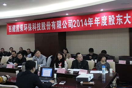 西藏國策環(huán)??萍脊煞萦邢薰?014年度年度股東大會(huì)在成都召開,董事會(huì)秘書楊偉強(qiáng)主持會(huì)議。董事長兼總經(jīng)理陳鴻、副董事長范津濤、副總經(jīng)理幸川、財(cái)務(wù)總監(jiān)趙永花、證券部經(jīng)理張麗等公司董事及核心成員出席本次會(huì)議。