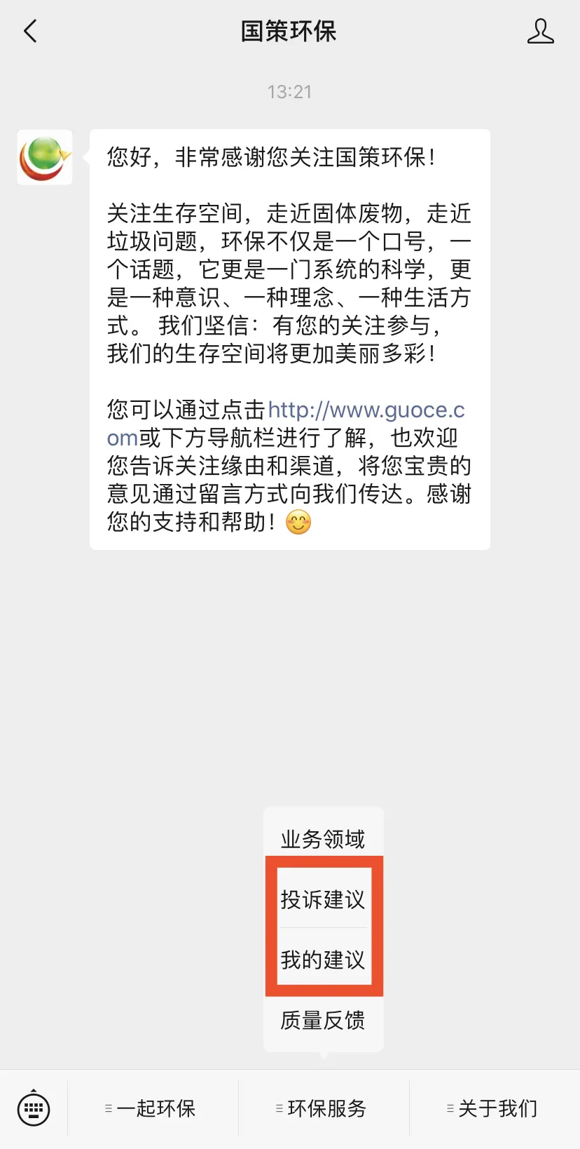 同時(shí),社會(huì)公眾可通過(guò)關(guān)注國(guó)策環(huán)保微信公眾號(hào),對(duì)國(guó)策環(huán)保運(yùn)營(yíng)項(xiàng)目的環(huán)衛(wèi)質(zhì)量和服務(wù)水平提出意見和建議,對(duì)保潔不到位、清運(yùn)不及時(shí)的路段或點(diǎn)位拍照上傳,反饋到云平臺(tái),國(guó)策環(huán)保將根據(jù)處理進(jìn)度,推送處理結(jié)果,達(dá)到社會(huì)共治的創(chuàng)舉。